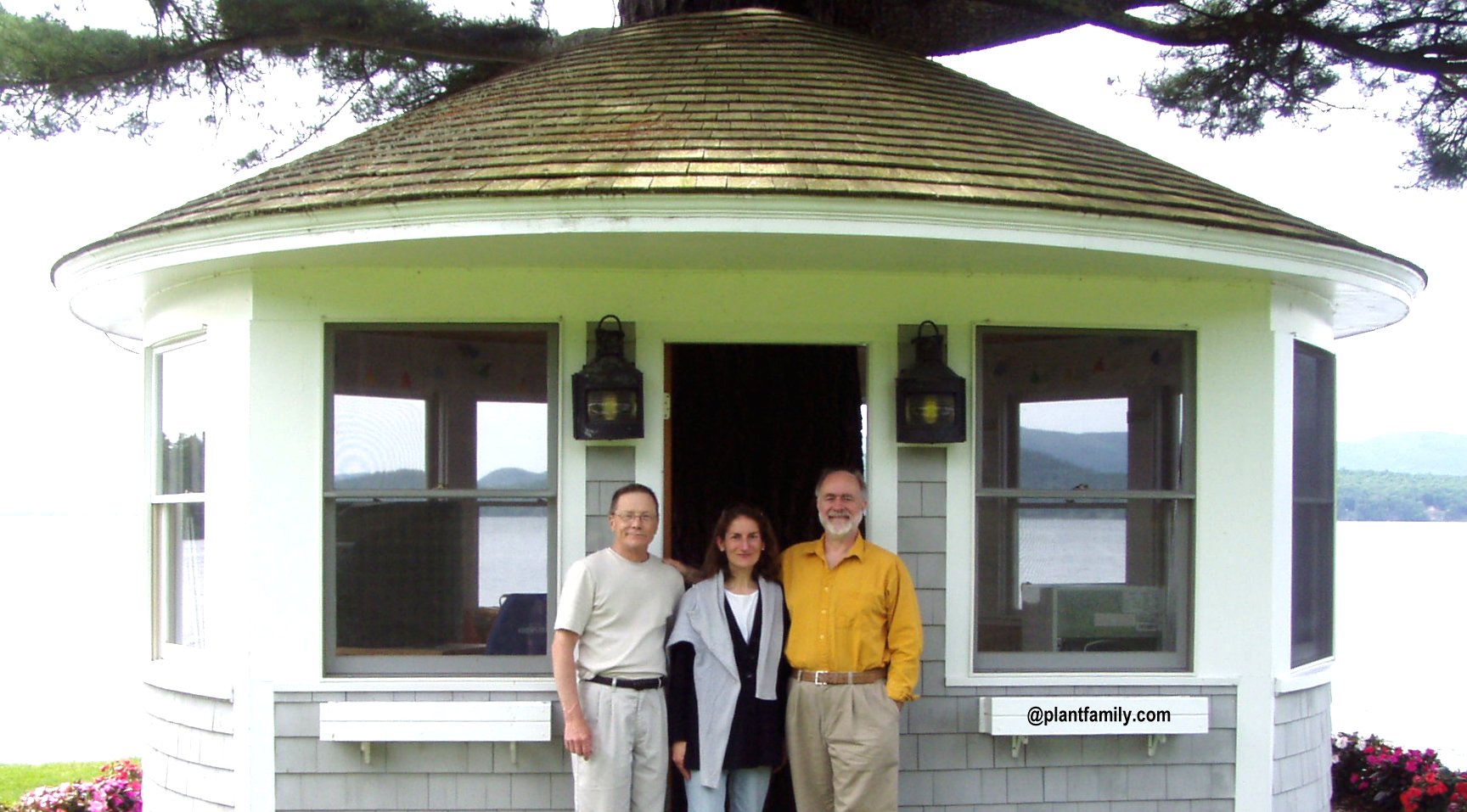| Cousins, Barry Rodrigue and Kenneth Plant, visit original burial site in Maine of Anthony and Sophia Plant. In June 2006 Barry and Ken made their way through Maine and New Hampshire to research the Rodrique (Roderick) and Plante (Plant) genealogy. | June 14, 2006, Kenneth Plant, great nephew of Thomas G. Plant, along with Cristina Ashjian, art historian and authority on Lucknow (Castle in the Clouds) in Moultonboro, New Hampshire, and Barry Rodrigue, pose in front of tea house on property once owned by Ken's great grandfather, William F. Plant, in the early 1900's at Tuftonboro Neck, New Hampshire. |